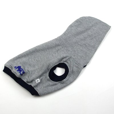 グレーをベースに袖回りと裾のリブ色をネイビー(紺色)にしたシンプルなパーカーです。収縮性のある比較的薄手のトレーナー生地ですので、お洋服の着用初心者ワンちゃんでもスムーズに着こなせるはずです。フード内側は肌ざわりの良いメッシュ素材を使用しております。